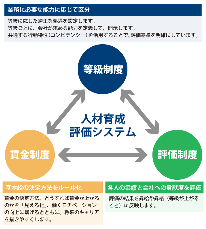 会社が要求する能力、個人が持っている能力にふさわしい給与、職位の関係性を明確化し、人が育つ賃金体系を運用することで、個人の業績と貢献度、信頼度を評価します。自分の現在地、目的地を明確にし、企業が発展、存続することに必要な個々の成長、人材の質を向上させることを目的としています。